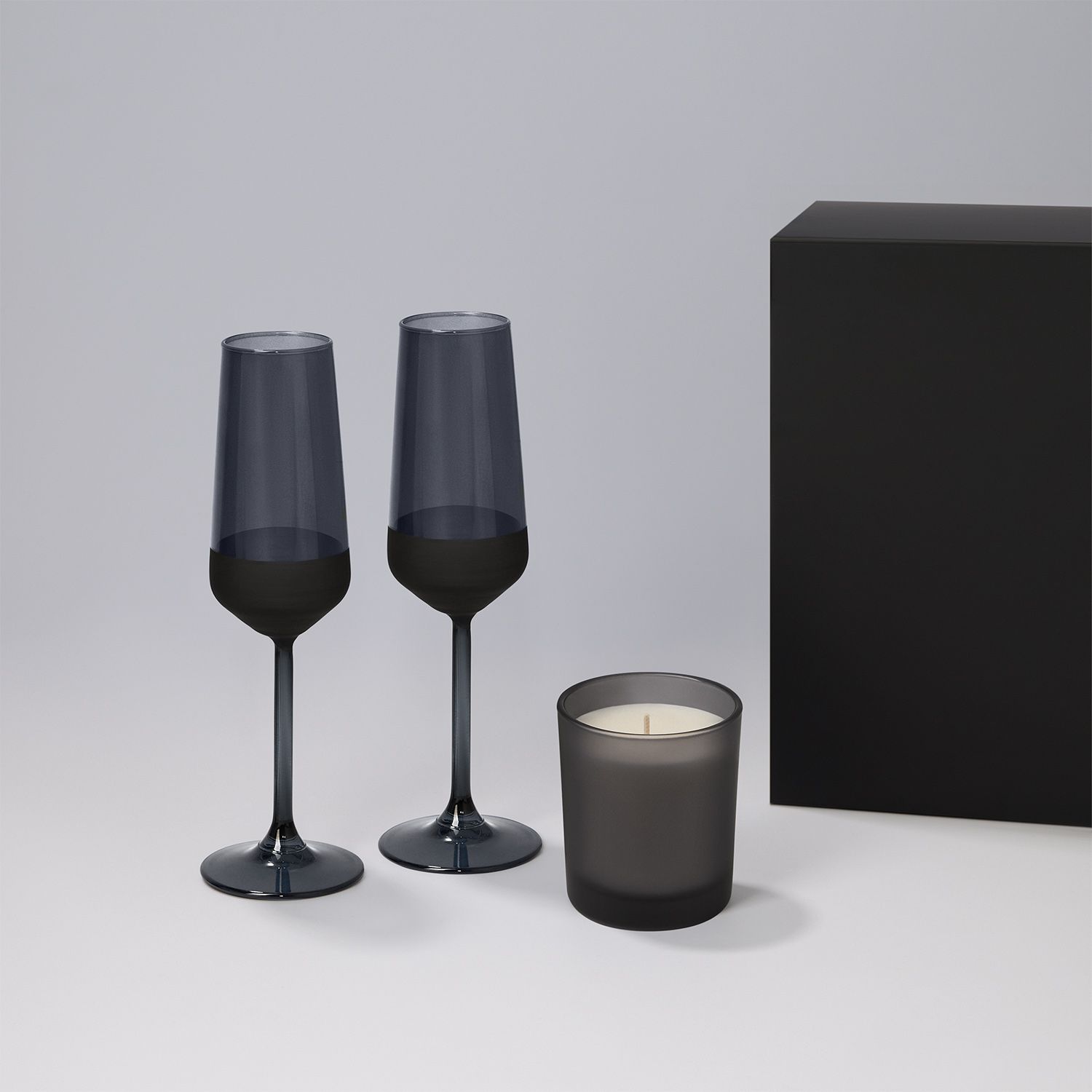 Подарочный набор свеча Энигма (Enigma) + 2 бокала для шампанского Блэк Эдишн (Black Edition) в серой коробке